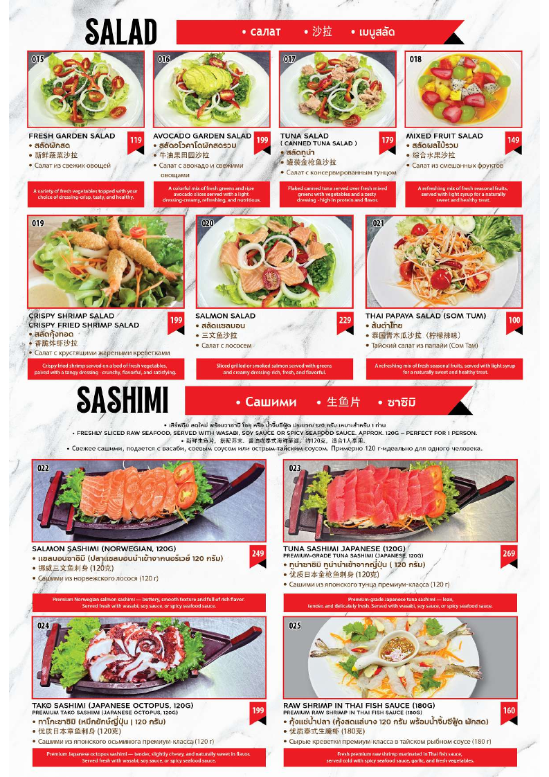 Start with their enticing appetizers like the crispy chicken satay or the delightfully fried shrimp crackers, each priced reasonably around THB 89. For sashimi lovers, the premium Norwegian salmon or Japanese tuna sashimi will surely impress, highlighting freshness and quality.